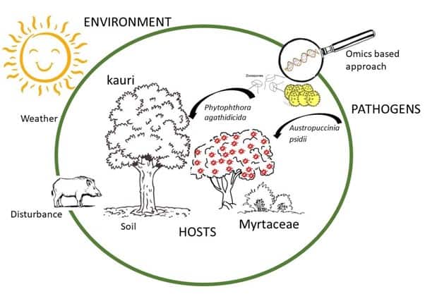 Plants and pathogens can both be influenced by a number of factors such as disturbance, topography, weather, soil type and pest control. These factors can, in turn, affect how the plant pathogens adapt to New Zealand’s environment.